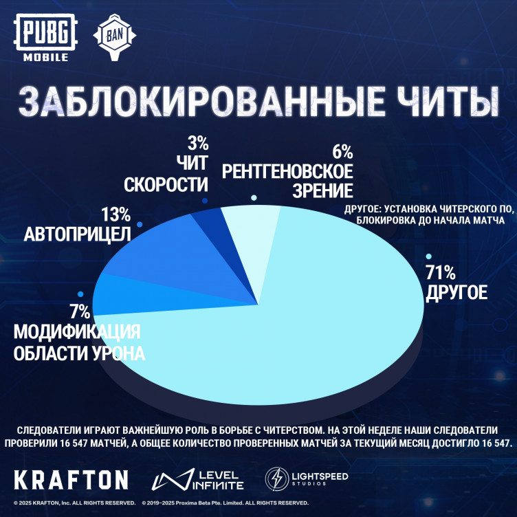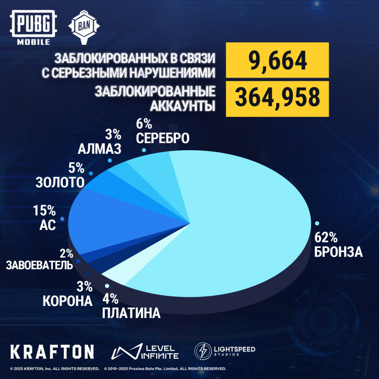 Разработчики мобильной версии PUBG забанили 364 тысячи аккаунтов читеров (и больше девяти тысяч устройств) за период с 3 по 9 октября 2025 года.