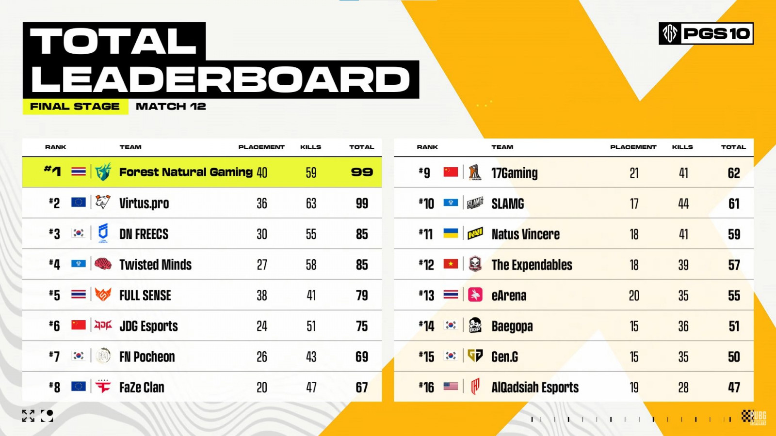 Коллектив Forest Natural Gaming перехватил лидерство в турнирной таблице PUBG Global Series 10 по итогам второго игрового дня гранд-финала – сегодня участники отыграли еще шесть матчей.
