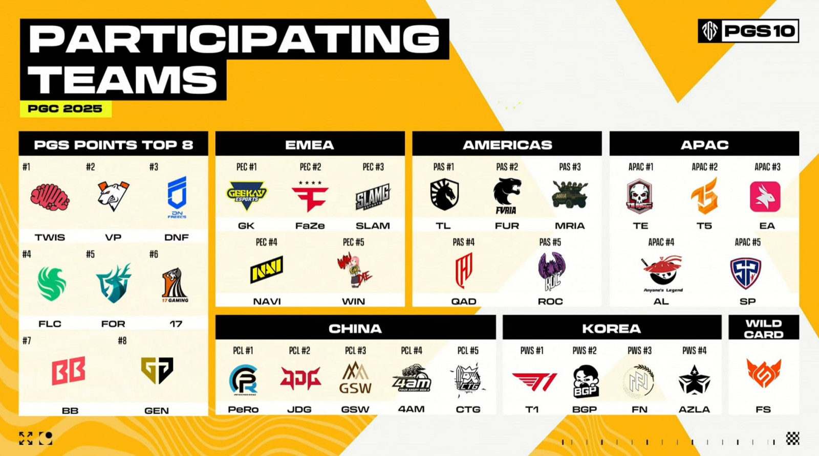 По очкам PGS на турнир прошли такие команды, как Twisted Mind, Virtus.pro, Freecs, Team Falcons, Forest Natural Gaming, 17 Gaming, BetBoom Team и Gen.G.