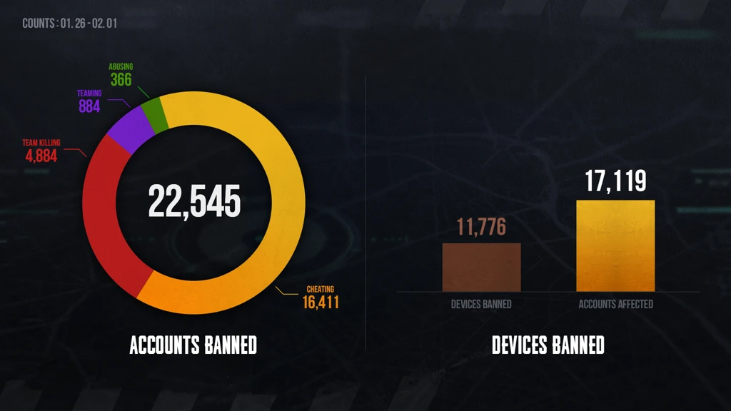 Разработчики PUBG: BATTLEGROUNDS забанили 22 тысячи аккаунтов (и более 11 тысяч устройств) за период с 26 января по 1 февраля 2026 года. Из них 16 тысяч аккаунтов получили бан за использование читов.