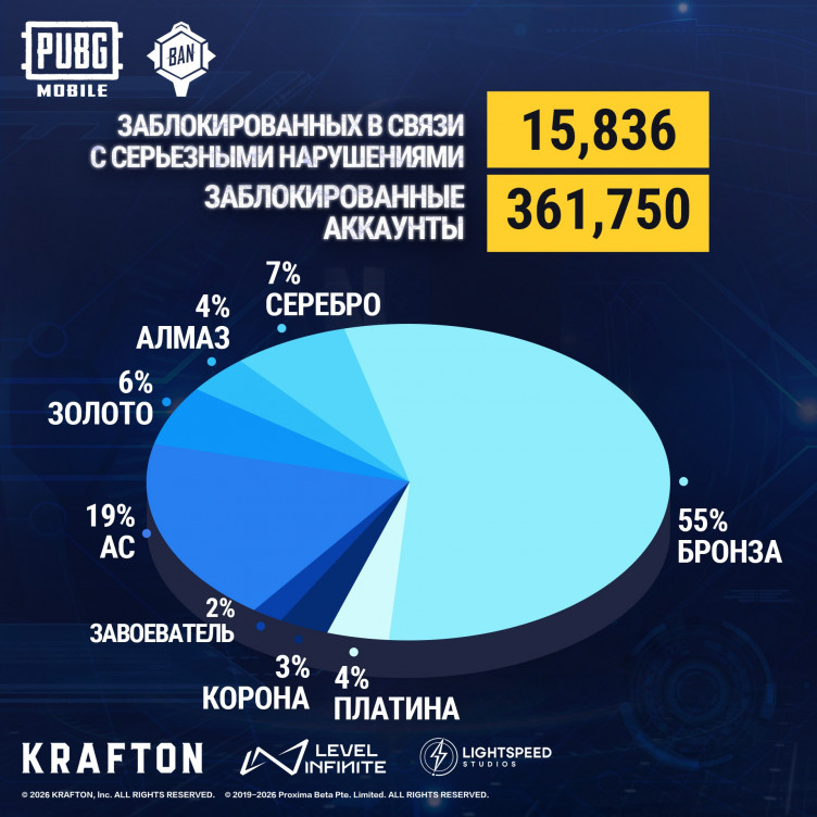 Разработчики мобильной версии PUBG забанили 361 тысячу аккаунтов читеров (и почти 16 тысяч устройств) за период с 30 января по 5 февраля 2026 года.