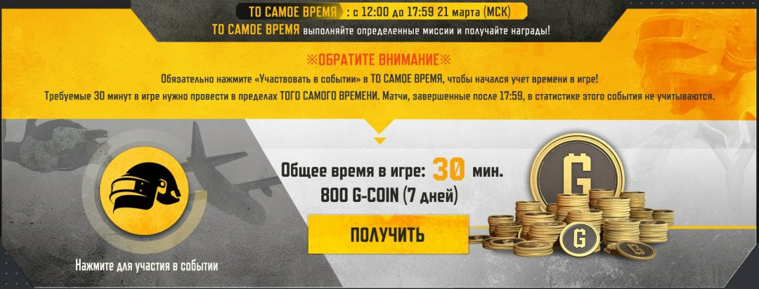 Привет, игроки! Событие «То самое время» вот-вот начнётся! Зайдите в игру и выполните задание в определённо время, чтобы получить 800 G-Coin!