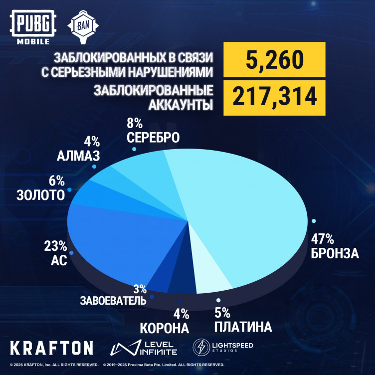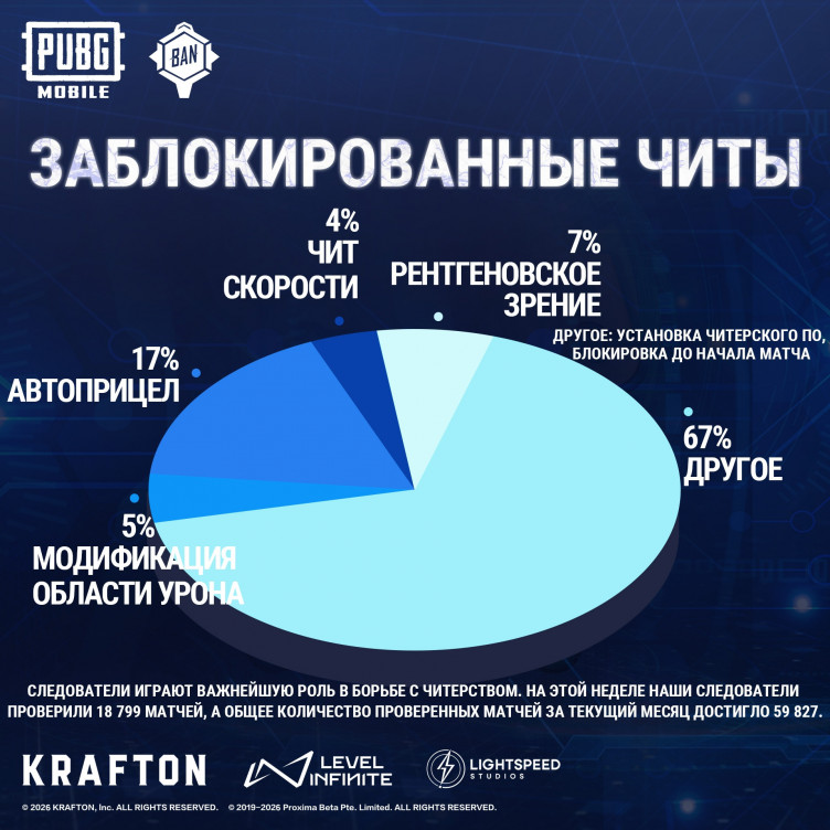 Разработчики мобильной версии PUBG забанили 217 тысяч аккаунтов читеров (и более 5 тысяч устройств) за период с 13 по 19 марта 2026 года.