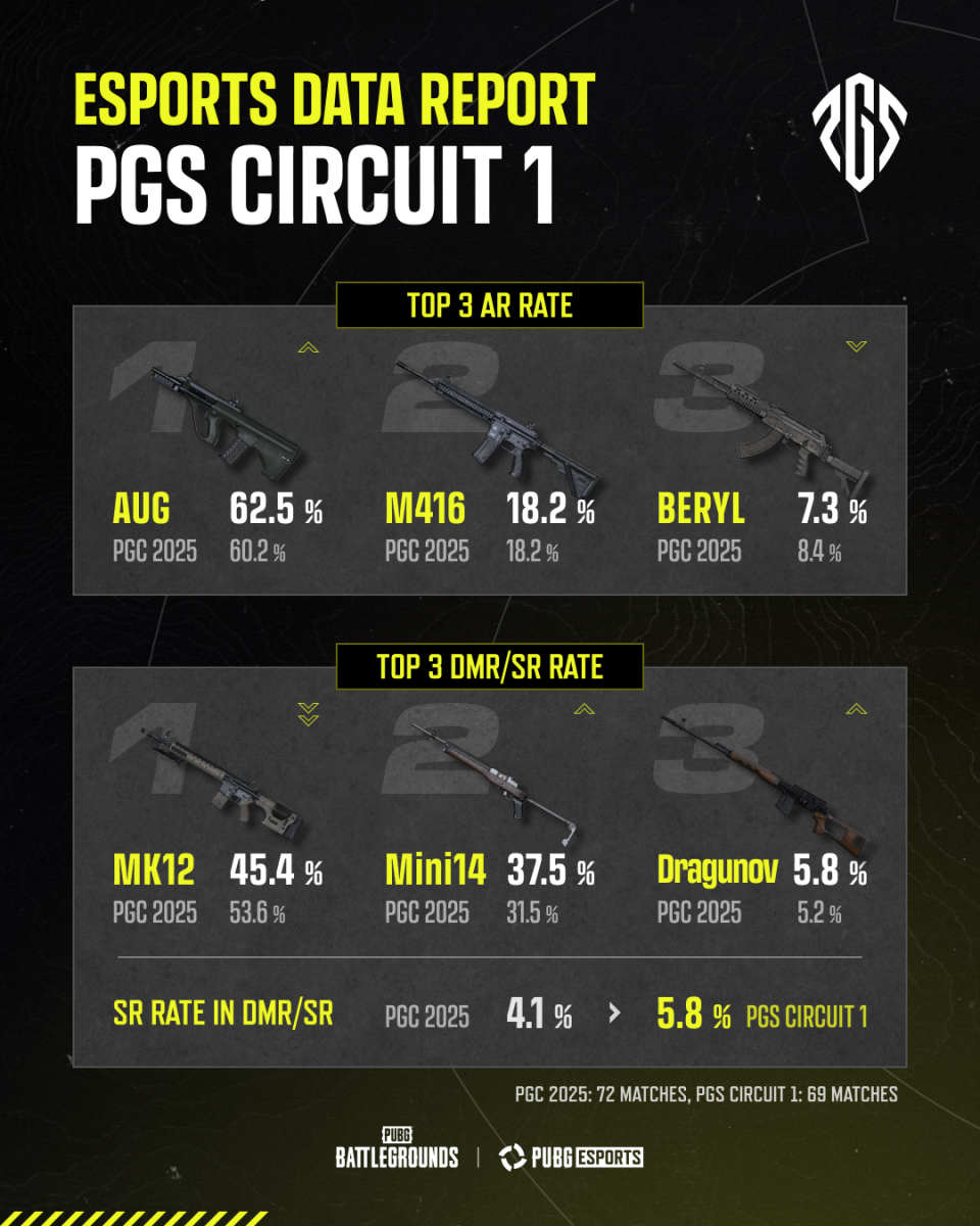 Первое место среди AR с большим отрывом занял AUG; в топ-3 также вошли M416 и BERYL. Среди DMR/SR на первой строчке оказался Mk12; в первую тройку также попали Mini-14 и «Драгунов».